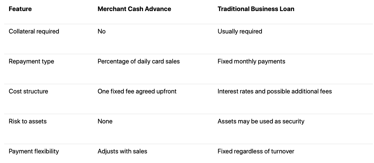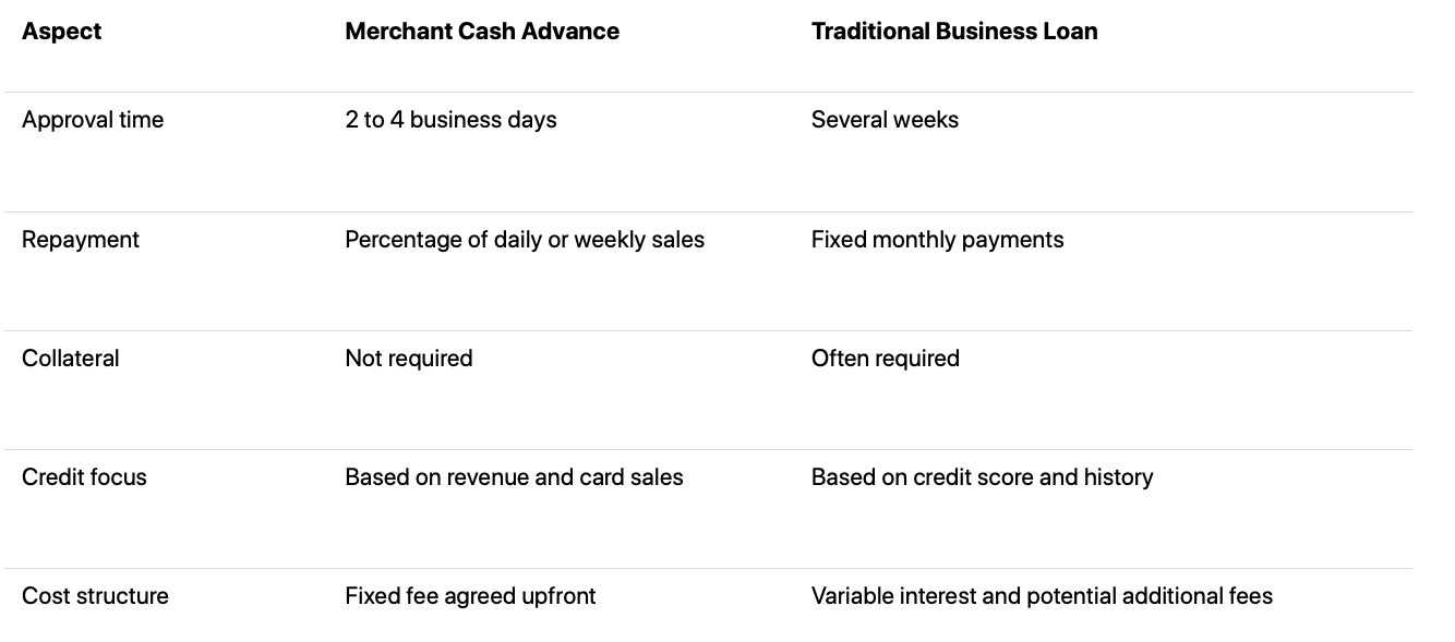 While both Merchant Cash Advances and traditional business loans provide access to capital, they operate in very different ways. The table below highlights the main distinctions between the two funding options.